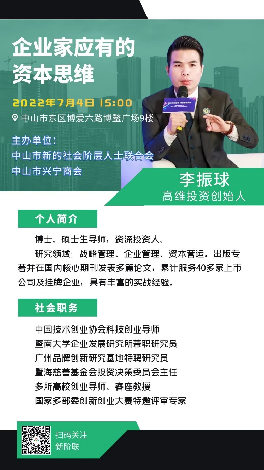 2022年7月4日下午,由中山市新的社會階層人士聯(lián)合會(以下簡稱“新階聯(lián)”)與中山市興寧商會(以下簡稱“興寧商會”)聯(lián)合舉辦的“企業(yè)家應有的資本思維”講座在振業(yè)優(yōu)控成功舉辦。講座特別邀請暨南大學企業(yè)發(fā)展研究所研究員、廣東高維投資管理股份有限公司創(chuàng)始人李振球擔任主講嘉賓。