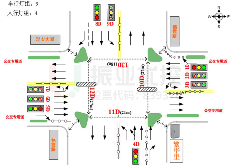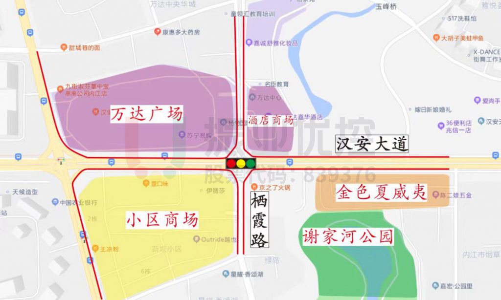 漢安大道與棲霞路交叉口(十字)位于內江市東興區(qū)萬達廣場東南側,由東西走向的漢安大道(雙向8車道)以及南北走向的棲霞路(雙向4車道)交叉組成。周邊分布有萬達廣場、金色夏威夷、謝家河公園及其它居民小區(qū)、酒店、商場,是機動車、非機動車及行人過街主要匯聚點。