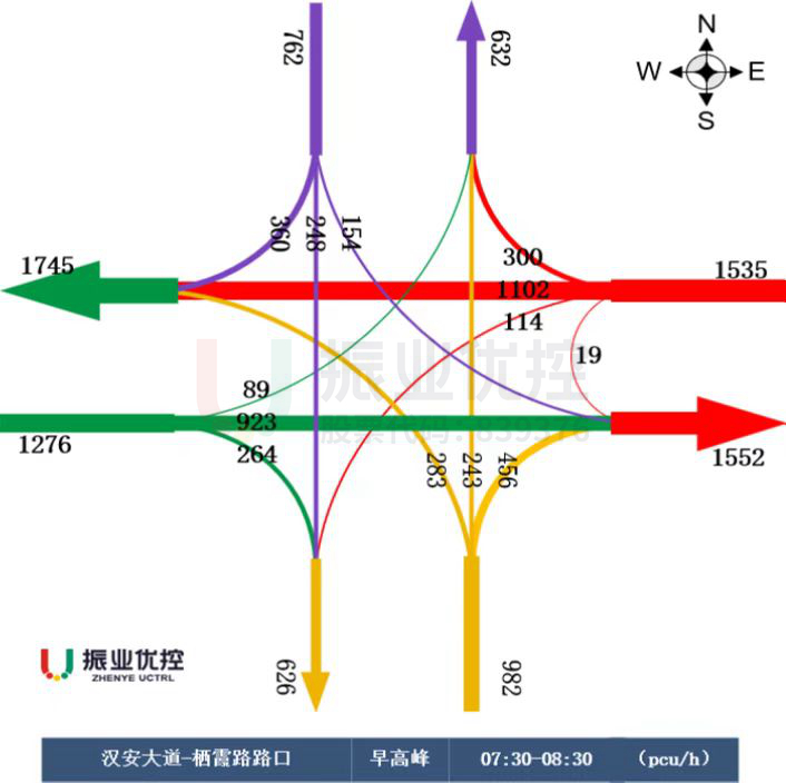 交叉口早高峰運行情況正常,擁堵主要集中在晚高峰(17:30-18:30)東進口。因東進口左轉和掉頭車道是同一個車道,且僅有一條車道,掉頭車輛會影響左轉車輛通行,導致東進口左轉車流排隊較長。