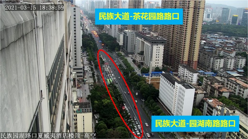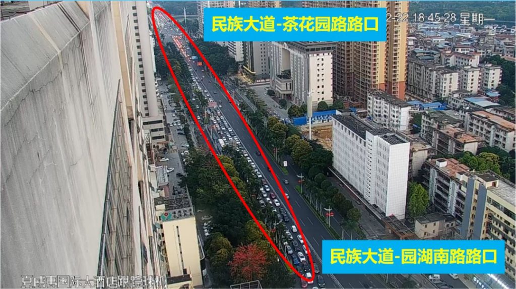 技術(shù)團(tuán)隊(duì)在充分挖掘現(xiàn)有道路的時(shí)空資源基礎(chǔ)上,在安吉大道、民族大道等路段,創(chuàng)新應(yīng)用“集裝箱式”綜合協(xié)調(diào)控制方案,利用綠波協(xié)調(diào)+紅波截流的組合方式,有效解決飽和流量路段車流擁堵回溢問(wèn)題。
