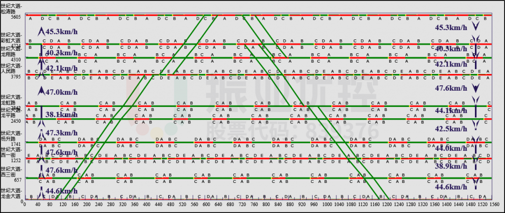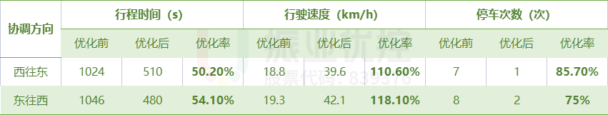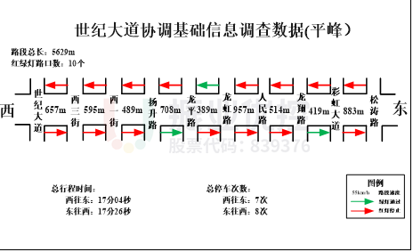 優(yōu)化后,平峰時(shí)段(9:00-16:30分)世紀(jì)大道西往東優(yōu)化前行程時(shí)間為17分04秒,優(yōu)化后行程時(shí)間為8分30秒;東往西優(yōu)化前行程時(shí)間為17分26秒,優(yōu)化后行程時(shí)間為8分鐘,通行效率平均提高52.2%,雙向總停車次數(shù)由15次降為3次。