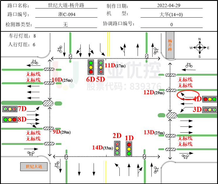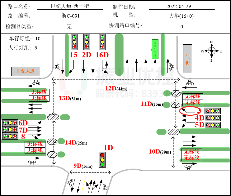 為保證市區(qū)交通效率,龍港市預(yù)設(shè)計(jì)環(huán)城綠波帶,如下圖所示。世紀(jì)大道為環(huán)城綠波帶的一部分,與彩虹大道交匯于世紀(jì)大道-彩虹大道路口,因而搭接彩虹大道出發(fā)右轉(zhuǎn)進(jìn)入世紀(jì)大道時(shí)運(yùn)行的相位為D相位。D相位為彩虹大道路口北進(jìn)口左轉(zhuǎn),為彩虹大道綠波協(xié)調(diào)相位,車輛經(jīng)此進(jìn)行左轉(zhuǎn)/右轉(zhuǎn)以匯入世紀(jì)大道。