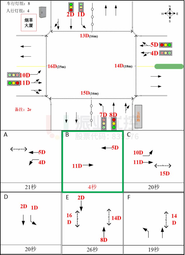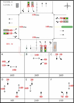 經排查,該路口硬件設備不適用“早切斷、遲啟動”的優(yōu)化手段,遂對該路口采用相位搭接的方法進行優(yōu)化(優(yōu)化后B相位),避免東進口左轉尾車車流與南進口行人沖突。