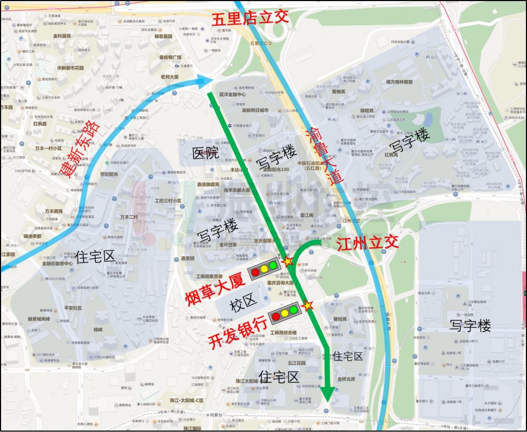 五簡路為重慶江北主城區(qū)重要交通道路,道路為南北走向,承載著五里店立交及江州立交兩座大型立交橋往來渝中區(qū)、南岸區(qū)、渝北區(qū)的交通流,且附近寫字樓、住宅區(qū)較為密集,日常人車流量巨大。