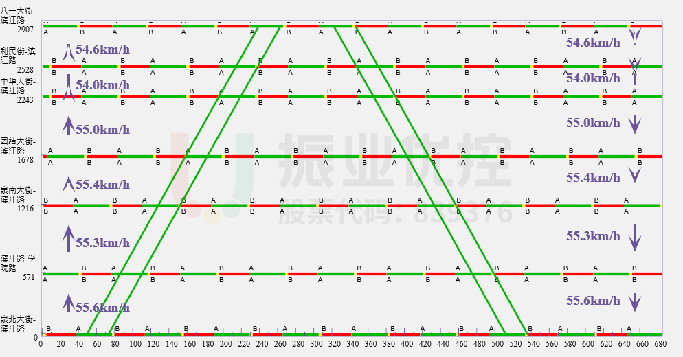 濱江路(泉北大街-八一大街)以南北為基準(zhǔn),設(shè)計(jì)南北雙向協(xié)調(diào)方案,設(shè)計(jì)速度為55km/h,雙向均可一次性通過。