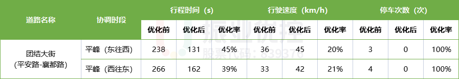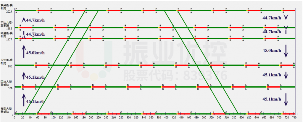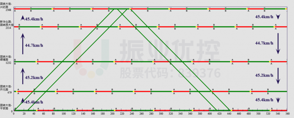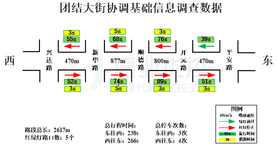 團(tuán)結(jié)大街(平安路-興達(dá)路)以東西為基準(zhǔn),設(shè)計(jì)東西雙向協(xié)調(diào)方案,設(shè)計(jì)速度為45km/h,雙向均可一次性通過。