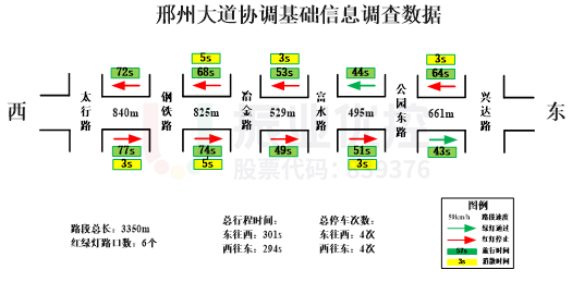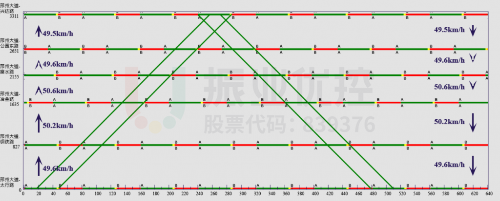 邢州大道(太行路-興達(dá)路)以東西為基準(zhǔn),設(shè)計(jì)東西雙向協(xié)調(diào)方案,設(shè)計(jì)速度為50km/h,雙向均可一次性通過。