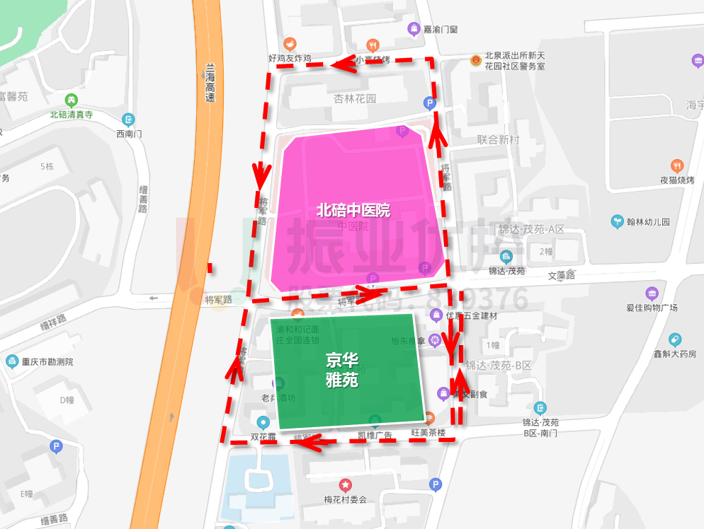 北碚城南中醫(yī)院為國家三級甲等醫(yī)院,年門診量30萬人次以上,醫(yī)院內(nèi)設有停車位215個。中醫(yī)院位于北碚老城區(qū)蘭海高速旁,區(qū)域由將軍路、文藻路等道路合圍而成,全線雙向兩車道,道路基礎薄弱,區(qū)域路網(wǎng)承載力差;周邊主要為新天花園、學府江山、京華雅苑等小區(qū)住宅樓,出行需求較為集中,區(qū)域交通異常擁堵并呈惡化趨勢。