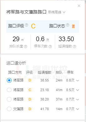 將軍路與文藻路交叉口擁堵指數(shù)下降明顯,優(yōu)化后路口排隊長度29m,環(huán)比優(yōu)化前的35m,下降17.1%;優(yōu)化后延誤指數(shù)33.5,環(huán)比優(yōu)化前延誤指數(shù)39.3,下降14.7%;擁堵評級從D級降為C級。