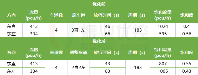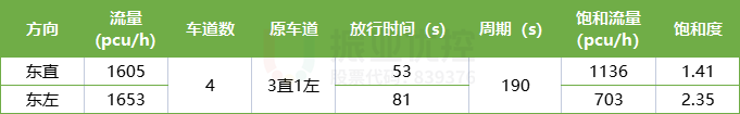 根據(jù)東進口出城方向早晚高峰流量分析,晚高峰時段出城車流較大,左轉(zhuǎn)一條車道飽和度達到2.35。通過重新規(guī)劃道路標線,東進口由原三直一左車道調(diào)整為兩直兩左車道,提高左轉(zhuǎn)車輛通行效率。