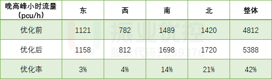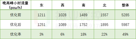 通過(guò)數(shù)據(jù)對(duì)比發(fā)現(xiàn),優(yōu)化后的北京路-人民路南北方向車(chē)流量有明顯提升,整體行車(chē)通過(guò)量增加,優(yōu)化效率達(dá)到11.9%;北京路-霖雨路通過(guò)增設(shè)借道左轉(zhuǎn)的方式,解決了南北左轉(zhuǎn)通行需求量大的問(wèn)題,整體優(yōu)化效率達(dá)到13.2%,通行效率得到提升。