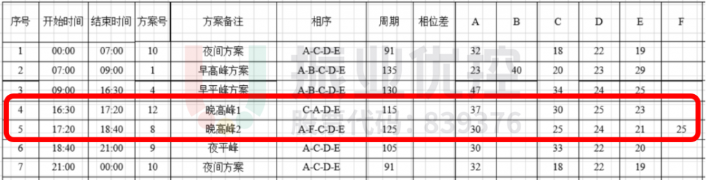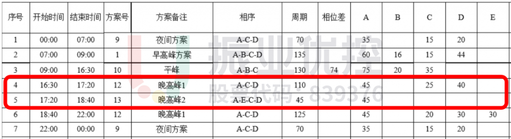 根據(jù)路口不同時段流量,精細化設(shè)計晚高峰方案。晚高峰時段,根據(jù)附近車流通行需求的變化情況,對時段進行分割。分別在16:30-17:20、17:20-18:40各設(shè)一套方案,以應(yīng)對需求的變化。