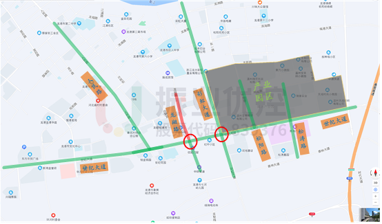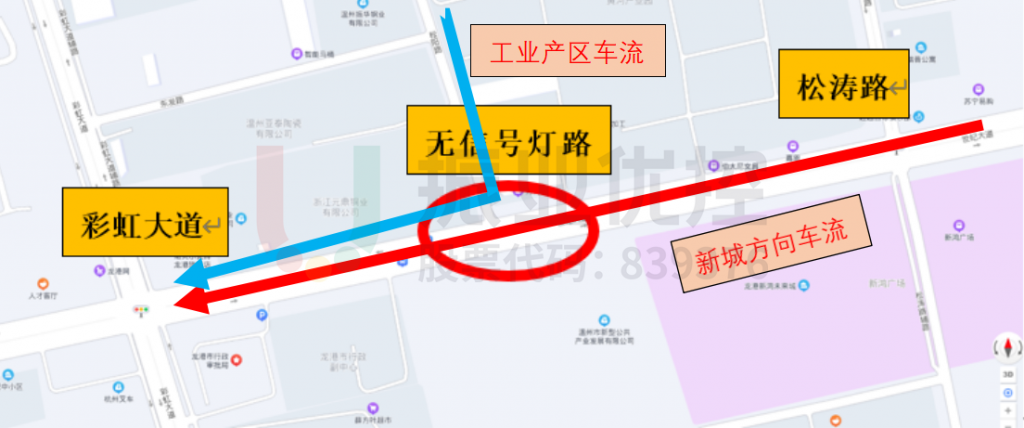 世紀大道與彩虹大道、龍翔路交匯而成的兩個路口相鄰且距離較近,為400米。其中,世紀大道-彩虹大道北至平陽縣重要通道車站大道、南連高速路口通道,是龍港市主要交通要點;而世紀大道-龍翔路北進口目前正施工中,南進口的車道功能與車輛容納能力均受到一定程度影響。