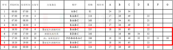 在不增加路口信號周期的情況下,調(diào)整路口相序,西單放放行時,東直行同步放行,同時考慮南左轉(zhuǎn)所需的消散時間長,因此設(shè)置西單放相位清空南左轉(zhuǎn)未消散車輛;并根據(jù)高峰車流特性,細(xì)致劃分多個高峰方案,具體方案如下: