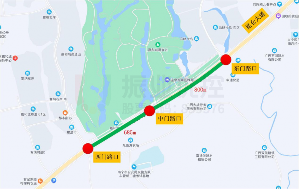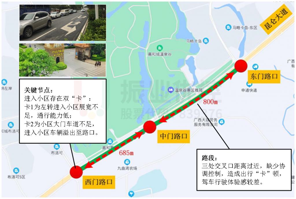昆侖大道-嘉和城西門、中門、東門路口均為昆侖大道進出嘉和城溫泉谷小區(qū)的T型路口,其中,西門路口是該小區(qū)居民出行的重要節(jié)點路口之一,晚高峰時段,車流量大,擁堵問題較為嚴重。