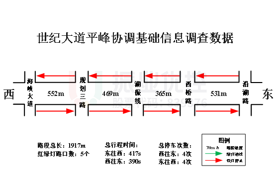 世紀(jì)大道(協(xié)調(diào)路段)設(shè)計(jì)東西雙向協(xié)調(diào)方案,設(shè)計(jì)速度為60km/h,東往西不停車通過(guò),西往東停車1次。
