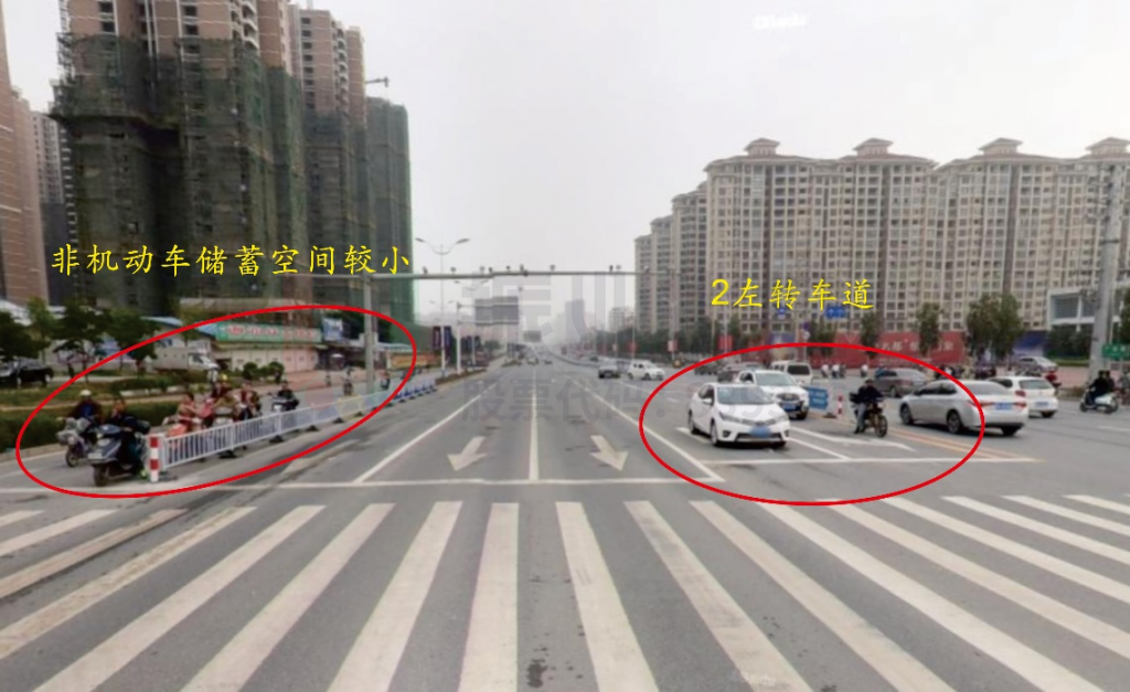 問題簡述:南北方向右轉(zhuǎn)機動車通行需求大,在非機動車較多時,由于非機動車道寬度較窄,路口排隊空間容易飽和,造成右轉(zhuǎn)機動車無法通行;高峰時段南出口左轉(zhuǎn)機動車通行需求大,由于只有一條左轉(zhuǎn)專用車道,部分車輛出現(xiàn)二次排隊的現(xiàn)象。