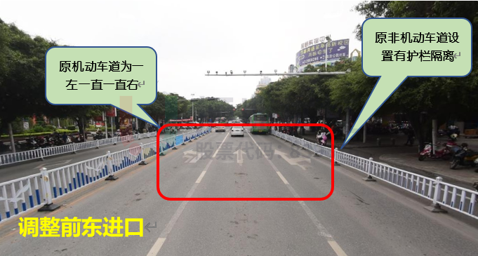 通過壓縮安全島、調(diào)整南進口左轉(zhuǎn)車道數(shù),解決了出口道機非混行現(xiàn)象和南北左轉(zhuǎn)通行流量不對等的情況。