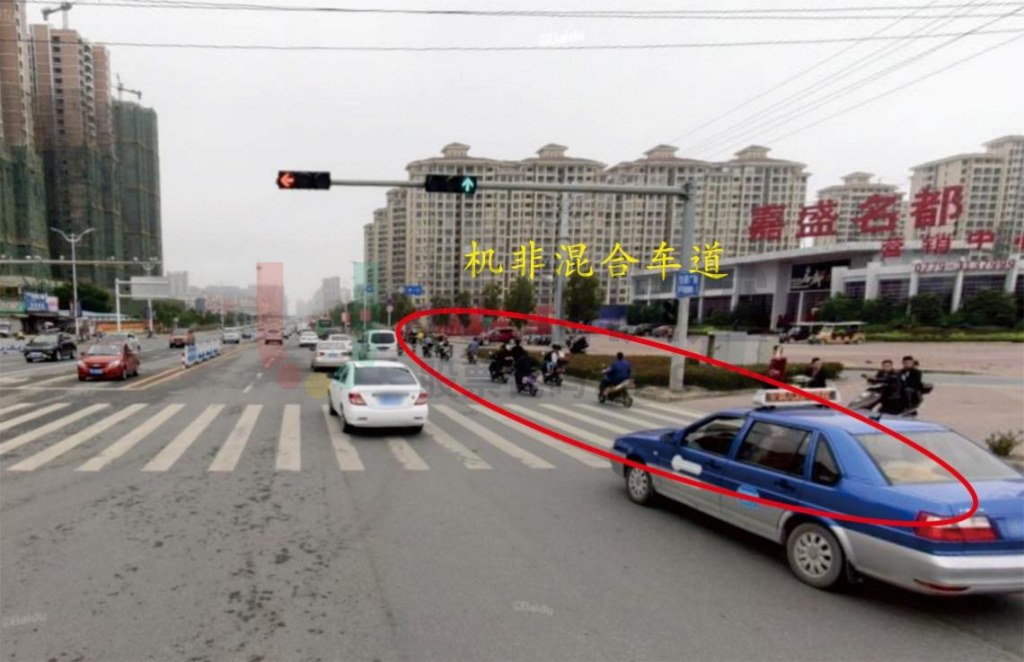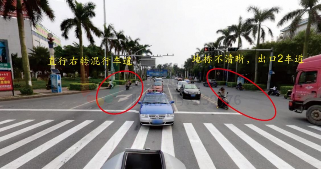 問題簡述:南進口直行與右轉(zhuǎn)為混合車道,出現(xiàn)直行車輛阻擋右轉(zhuǎn)車輛現(xiàn)象,右轉(zhuǎn)車輛通行效率較低;南出口標志、標線不清晰,存在安全隱患。