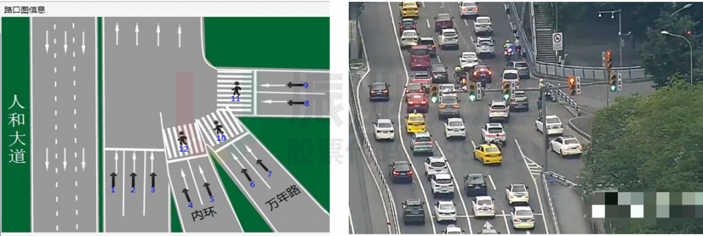 人和場(chǎng)口路口屬于復(fù)雜的多車道匯入路口,人和大道、內(nèi)環(huán)下道、萬年路、龍壽支路4個(gè)方向共計(jì)10條車道匯入4車道。由于出口道車道與進(jìn)口道車道的數(shù)量不匹配,路口出現(xiàn)車輛交織嚴(yán)重、通行效率低的現(xiàn)象。