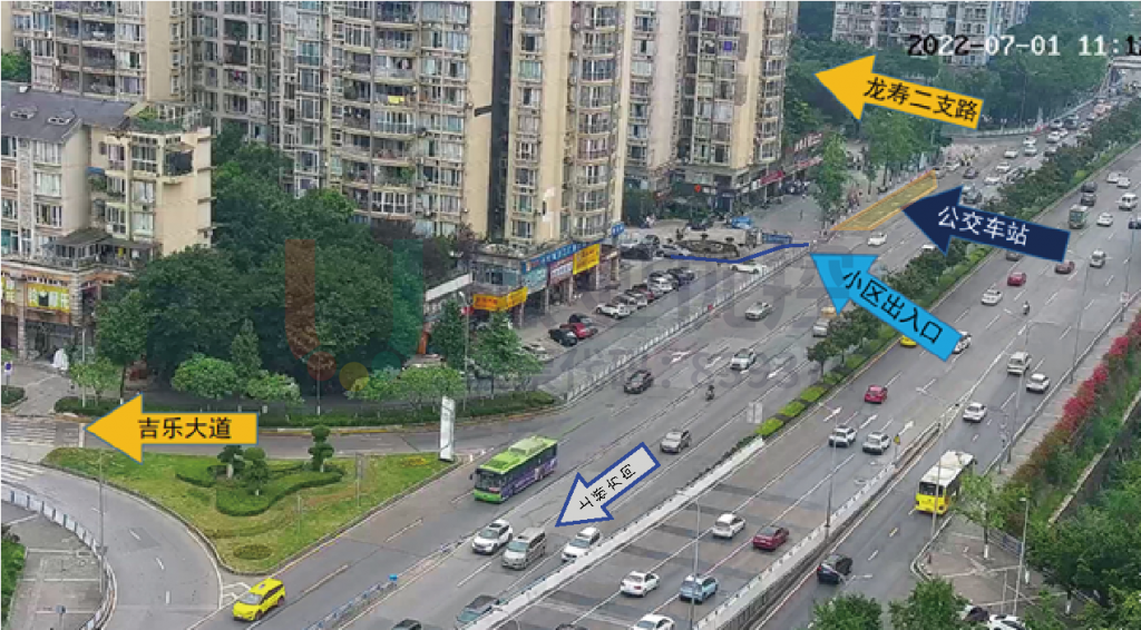 人和場(chǎng)口路口至古木峰立交上橋處僅330米,但該路段有2個(gè)出口(古木峰上橋、古木峰匝道)、2條支路(龍壽二支路、吉樂大道)、1個(gè)公交車站、1個(gè)區(qū)車庫進(jìn)出口,車輛變道交織嚴(yán)重、事故頻發(fā)。