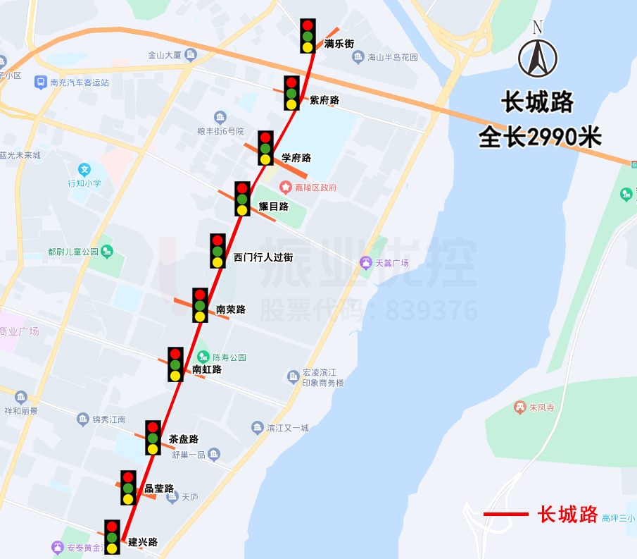 長城路是南充嘉陵主城區(qū)南北方向的主要干道之一,沿線分布著眾多學校(嘉陵南高、光彩實驗小學)、住宅區(qū)(泥溪口小區(qū)、源泉小區(qū)等)、市場商圈(光彩大市場、保利購物中心)、公園(陳壽公園)等主要交通吸引點,道路日常承擔著巨大的通行壓力。路段全長2.9公里,共涉及10個信號燈路口,早晚高峰南北直行車流量較大。