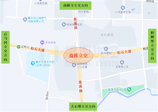 為進(jìn)一步緩解盤溪片區(qū)交通擁堵,提高車輛通行效率,2020年5月,重慶市江北區(qū)正式啟動(dòng)盤溪立交改造工程,將盤溪路-松石大道路口(平面)施工改造為盤溪三層“菱形”立交,即松石大道下穿直行(雙向六車道),盤溪路上跨直行(雙向四車道),中間采用平面交叉口完成各方向之間的交通轉(zhuǎn)換。2022年12月29日,盤溪立交正式通車,形成了上有上跨橋、下有下穿道、中間有信號(hào)燈轉(zhuǎn)換的三層立體交通路網(wǎng)體系,周邊交通得到了極大改善。