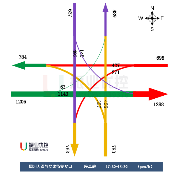 1.高峰期間,車輛集中出行,交叉口車流匯聚較快,通行壓力較大。交叉口總流量達(dá)3324pcu/h,其中西進(jìn)口車流量為1206pcu/h(直行車流量1143pcu/h,左轉(zhuǎn)車流量63pcu/h),占總車流量的36.2%。