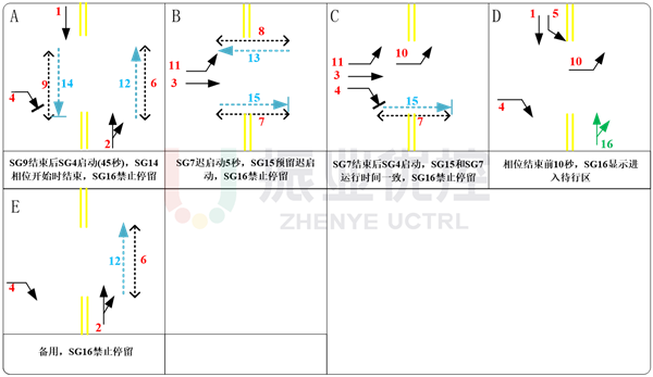 根據(jù)交叉口增設(shè)非機(jī)動(dòng)車信號(hào)燈及直行待行區(qū)控制,結(jié)合原放行方式對(duì)相位方案進(jìn)行調(diào)整: