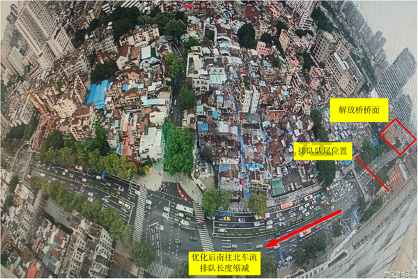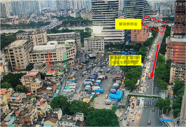 交叉口南側(cè)上游為解放大橋,日常車輛通行需求大,晚高峰時(shí)期車流甚至排隊(duì)至解放大橋橋面。