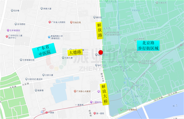 解放路-大德路交叉口位于廣州市越秀區(qū)解放路、大德路交界處,毗鄰北京路步行街區(qū)域,西側(cè)500米為廣東省中醫(yī)院,周邊商業(yè)活動(dòng)密集,且醫(yī)院較多,行人過街需求大,各進(jìn)口均設(shè)置為一次過街。該交叉口往南連接解放大橋,為連接海珠區(qū)、荔灣區(qū)的主要橋梁之一,日常通行流量較大。