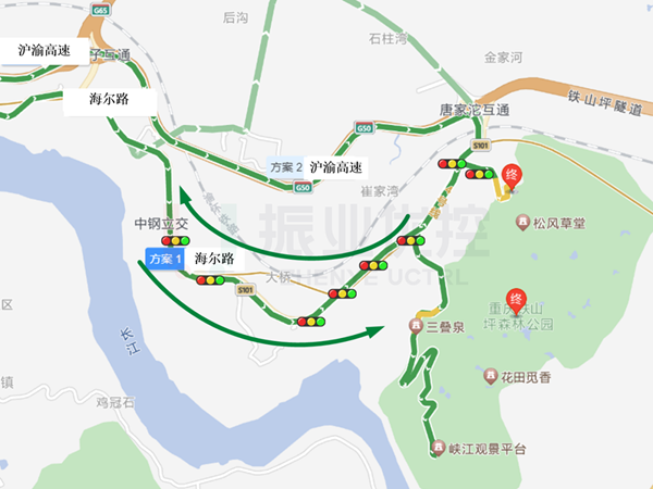 假期間,市民游客自駕前往鐵山坪森林公園的需求旺盛,11:00-16:00時段易出現(xiàn)擁堵情況,信控團隊針對兩條自駕游熱門路線,設計出保障預案。