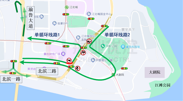 根據(jù)江北嘴區(qū)域停車場停車飽和程度,對多個節(jié)點路口實施交通管制,禁止左轉(zhuǎn)或右轉(zhuǎn),引導車流向外駛?cè)胗弭敶蟮?、五簡路、北濱一路、北濱二路,實現(xiàn)進出有序循環(huán),路網(wǎng)運行暢通。