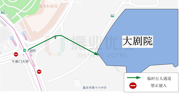 高峰時段,一是對千廝門大橋進行臨時交通管制,禁止車輛通行,避免人車交織,確保行人安全;二是從輕軌站到重慶大劇院,臨時增加一條行人通道,確保路段行人通行安全,實現(xiàn)人車分離;三是對金沙門路-文星門街路口信號燈進行臨時管控,調(diào)整為熄燈狀態(tài),提高行人過街通行效率。
