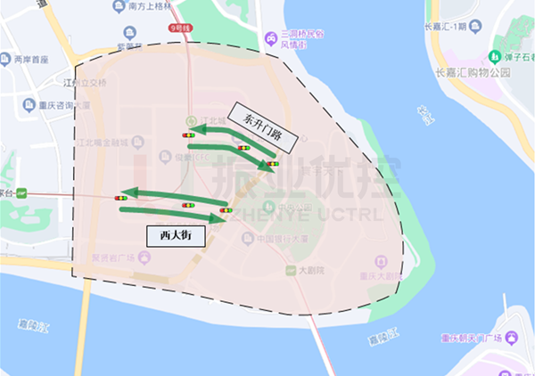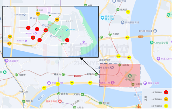 江北嘴區(qū)域內(nèi)重慶大劇院、江灘公園洪崖洞觀景區(qū)、千廝門大橋等熱門景點眾多,綜合分析歷年節(jié)假日期間上述景點周邊重要節(jié)點路口的交通流量流向變化情況,設置路口信號控制預案,調(diào)整各向綠燈放行時間,降低匯入方向綠信比,提高駛出方向綠信比,控制進入江北嘴區(qū)域的交通量,實現(xiàn)車輛少進多出,避免出現(xiàn)區(qū)域擁堵現(xiàn)象。