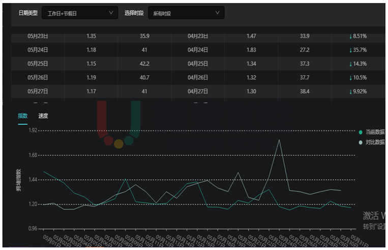 全天擁堵延時指數(shù)下降明顯,平均指數(shù)下降10%以上,效果良好。