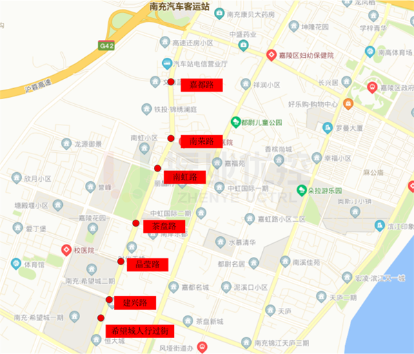 嘉南路為新建改造道路,是南充市嘉陵區(qū)南北通行的主要道路之一,全長1.9公里,分布7個(gè)路口。路段雙向8車道,設(shè)置有中央隔離護(hù)欄與非機(jī)動(dòng)車道,道路條件良好,平均車速可達(dá)40km/h-50km/h。