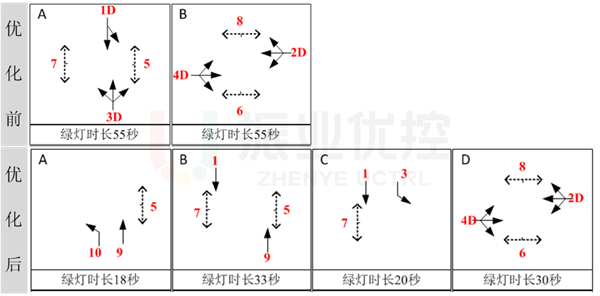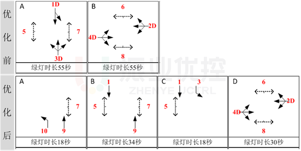 本案例中新改(擴(kuò))建的城市道路,通過優(yōu)化相位相序,將原來的簡單兩相位調(diào)整為直行-左轉(zhuǎn)搭接相位相序,減少?zèng)_突和延誤;并根據(jù)車流量變化情況,調(diào)整配時(shí),減少支路空放情況,提高綠燈利用率;同時(shí)將上下游路口進(jìn)行聯(lián)動(dòng)綠波協(xié)調(diào),讓信號燈更智能,進(jìn)一步提升通行效率。