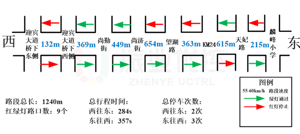 本案例根據(jù)路段沿線分布的不同城市功能區(qū)、流量不均衡和路口間距差異等不同特點,量身打造出分段式綠波,較好改善了沿線交通運行情況。