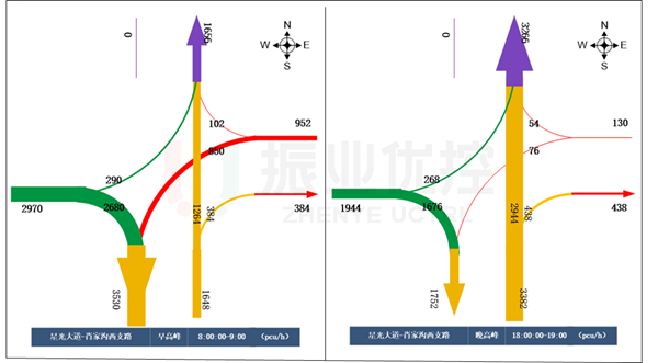 改造后,路口南進(jìn)出口(星光大道)高峰期間潮汐現(xiàn)象、東進(jìn)口空放情況得到有效緩解。