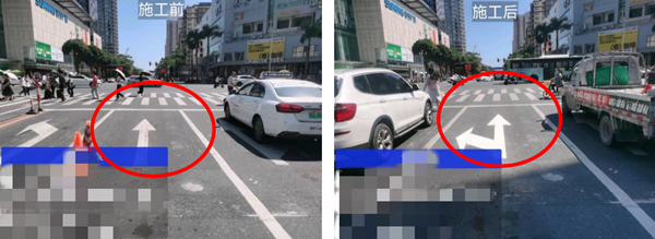 針對(duì)7個(gè)路口不同進(jìn)口存在的擁堵問(wèn)題,結(jié)合交通流量特征變化情況,對(duì)車(chē)道功能劃分進(jìn)行調(diào)整,并同步更新對(duì)應(yīng)的標(biāo)志標(biāo)線、優(yōu)化放行方式,提高路口整體通行能力,縮短路段行車(chē)延誤。