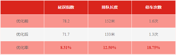 春華路-柏楊東路、 春華路-竹公溪街兩個路口的延誤指數(shù)、排隊長度和停車次數(shù)均有不同程度的下降。