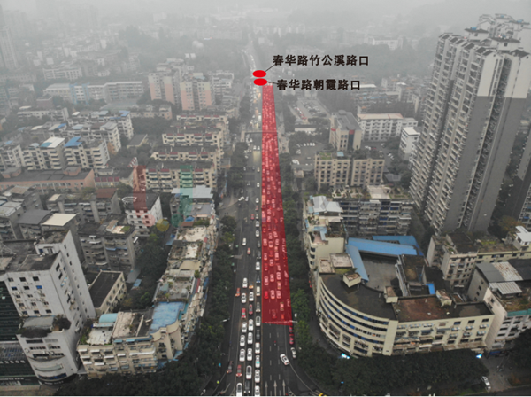 高峰時段,對相鄰的北邊春華路-柏楊東路路口、南邊春華路-竹公溪路口的信控方案進行同步調(diào)整,加快節(jié)點春華路-朝霞路路口車流疏散。
