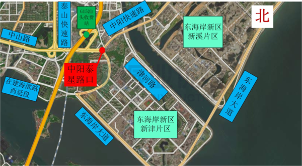 中陽大道為城市主干道路,主線雙向六車道,輔道雙向四車道,是貫穿汕頭中心城區(qū)和新東區(qū)、澄海區(qū)的重要通道。中陽泰星路口為新東區(qū)往返汕頭中心城區(qū)的重要節(jié)點路口,早晚高峰存在潮汐現(xiàn)象,南進(jìn)口上班上學(xué)往返車流量較大,西進(jìn)口下班返程車流聚集快。