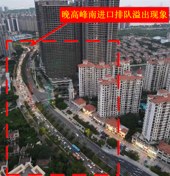 晚高峰時段,西進(jìn)口車流聚集較快,現(xiàn)有車道通行能力難以及時消散大量聚集車流,呈現(xiàn)過飽和狀態(tài)。另外,由于該進(jìn)口段存在小區(qū)出入口車流干擾,出現(xiàn)車流“斷流”與排長隊現(xiàn)象,排隊長度超過500米,經(jīng)常排隊到中山東路下匝道處,影響主路正常通行。