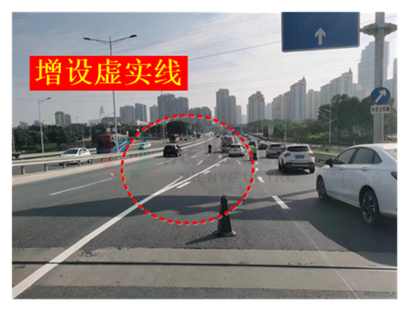- 明確路權(quán):西往東方向中陽快速路駛?cè)胼o道方向設(shè)置虛實線,明確通行規(guī)則;